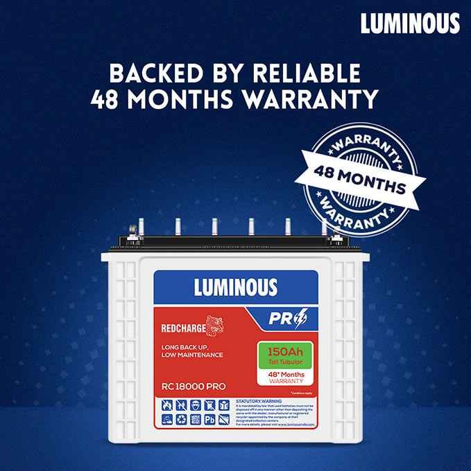 24 Months (Free of cost) + 24 Months (Pro-rata) In case battery develops any technical fault, contact customer care executive at 99999 33039 or send e-mail at care@luminousindia.com. For more details, refer to the warranty card provided with each product or please refer – https://www.luminousindia.com/terms-conditions.