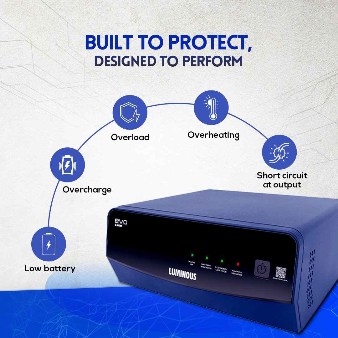 EVO D series with modified square wave technology is equipped with an advanced microprocessor, fast charging,  user friendly LED indications and many other protection features and alarms. It is suitable for homes, offices and small commercial applications.